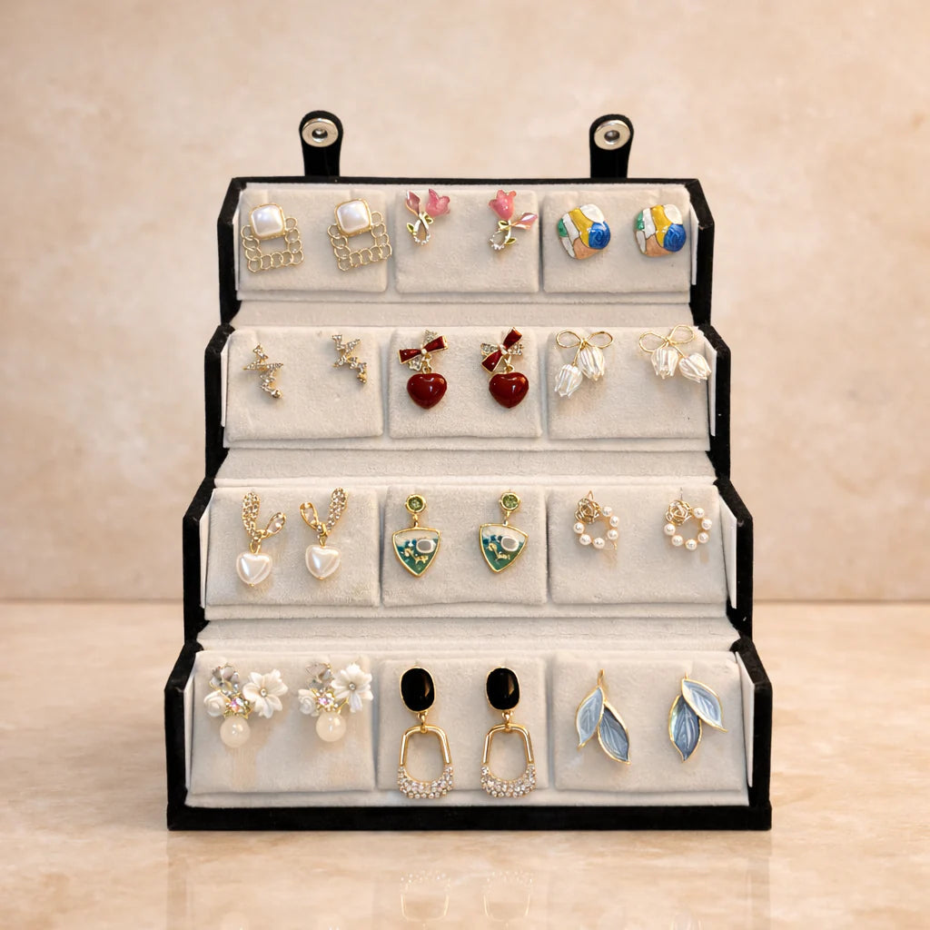 Packed neatly in a premium foldable velvet jewellery box, this combo keeps your earrings organised, protected, and beautifully displayed.